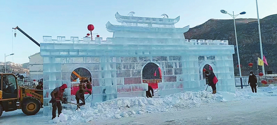 圖為偏關(guān)老牛灣景區(qū),冰雕師傅們正精心打磨冰雕作品。 本報記者攝