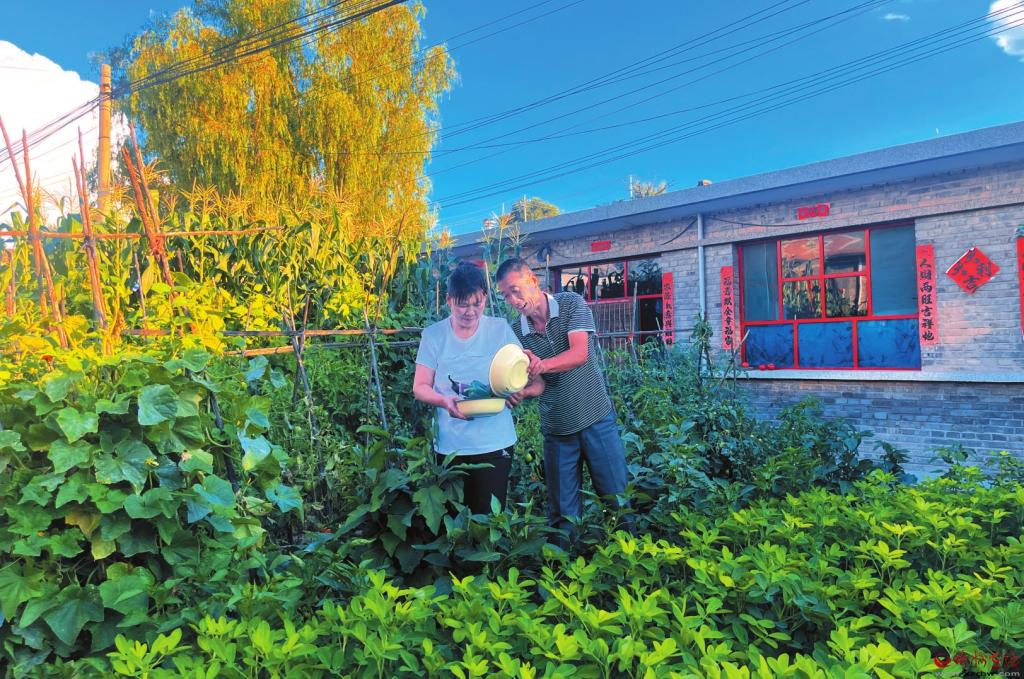 村民在庭院里采摘蔬菜