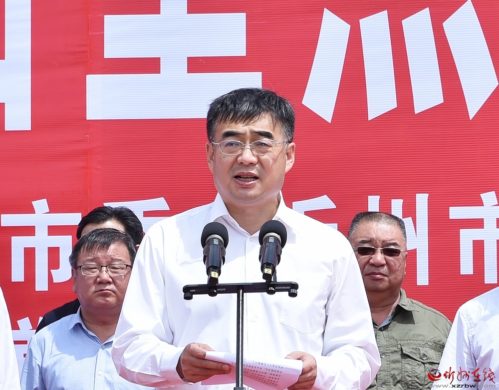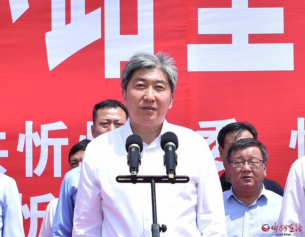 李建國(guó)主持。馮曉磊 攝 啟動(dòng)儀式上,朱曉東、李建國(guó)、郭奔勝、王珍、范建民分別為各指揮部授旗。原平市市長(zhǎng)、定襄縣縣長(zhǎng)、市交通運(yùn)輸局局長(zhǎng)分別就忻原大道將軍山隧道控制性工程和忻原大道跨朔黃鐵路、滹沱河大橋控制性工程及太忻大道跨二廣高速控制性工程建設(shè)作表態(tài)發(fā)言。