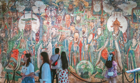 永樂(lè)宮“壁彩重華”展廳內(nèi),在3D打印、數(shù)字壁畫(huà)、AR識(shí)別等數(shù)字技術(shù)加持下,700多年前的壁上丹青,完美再現(xiàn)絕世容顏。