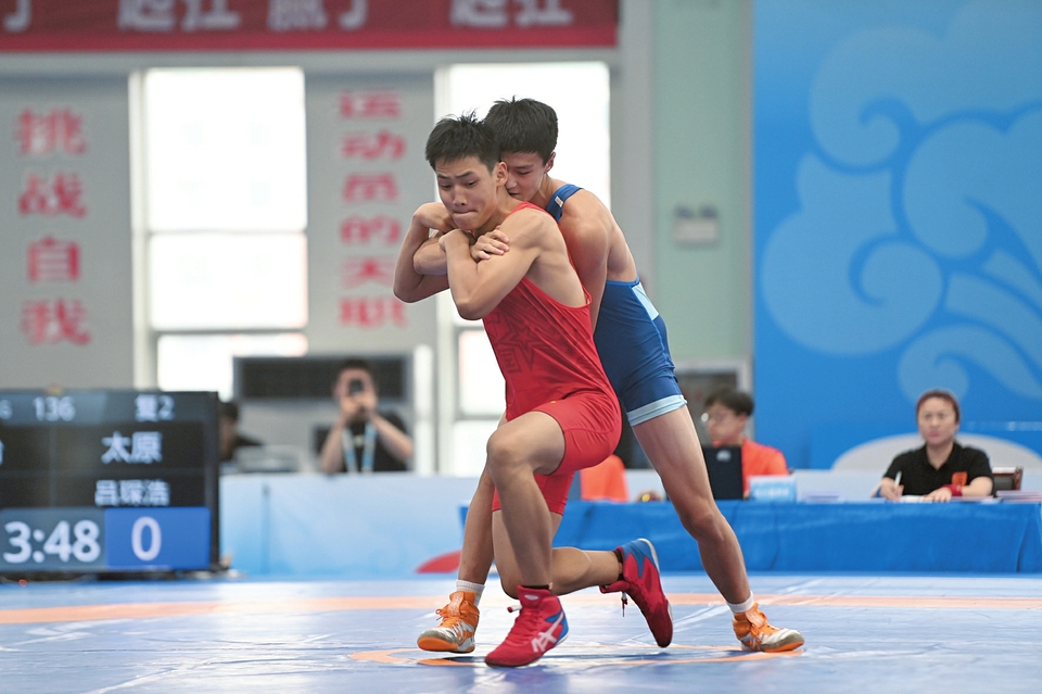 8月17日,省第十六屆運(yùn)動(dòng)會(huì)古典式摔跤比賽舉行,運(yùn)動(dòng)員們進(jìn)行技術(shù)與力量的比拼。本報(bào)記者阮洋攝