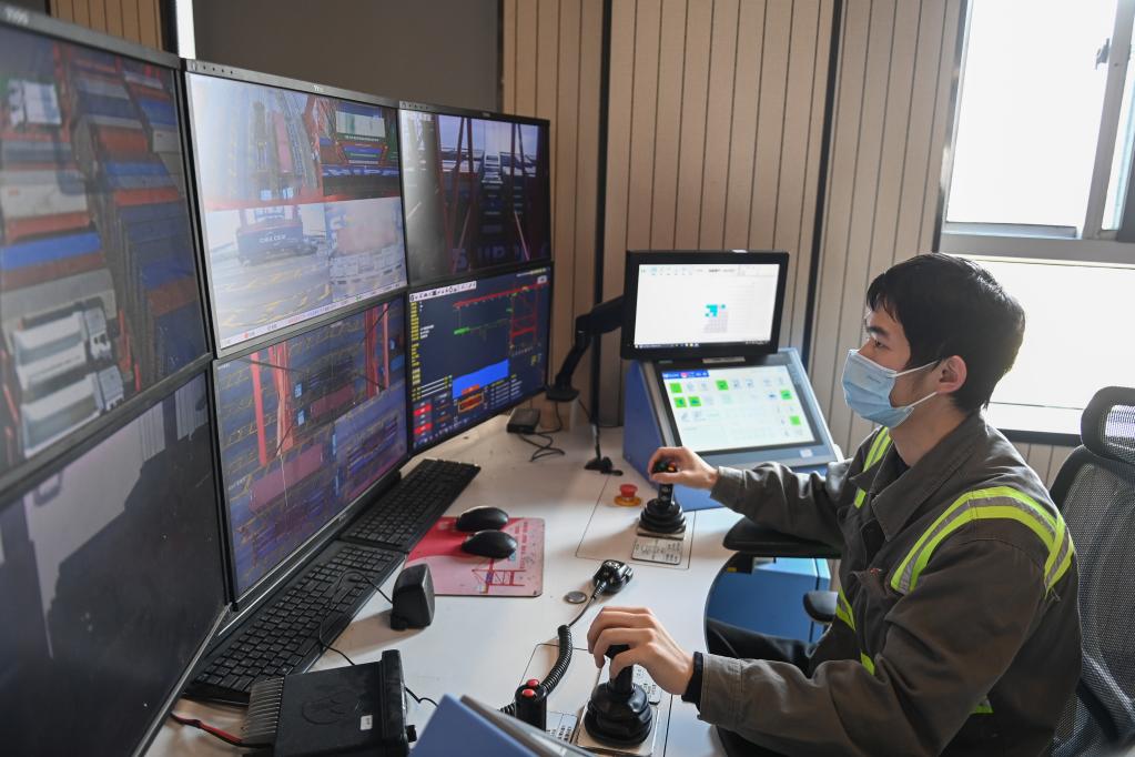 圖為寧波舟山港梅山港區(qū),橋吊司機在操作橋吊遠程控制系統(tǒng)。新華社記者黃宗治 攝