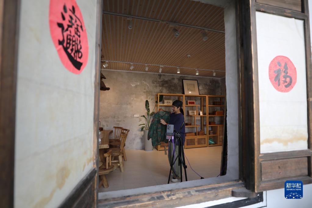 5月23日,在浙江省義烏市李祖村,創(chuàng)客鮑麗萍在店鋪里為網(wǎng)絡直播銷售做準備。