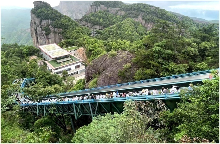 5月27日,在浙江省仙居縣神仙居景區(qū),游客絡繹不絕,排隊搭乘纜車和自動扶梯上山觀景。