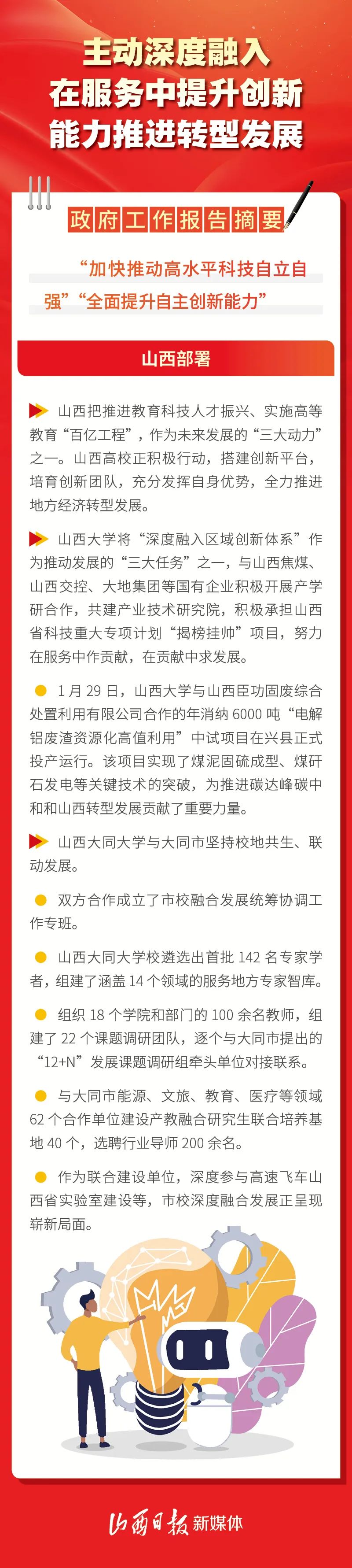 今年政府工作報告指出,堅持教育強(qiáng)國、科技強(qiáng)國、人才強(qiáng)國建設(shè)一體統(tǒng)籌推進(jìn),創(chuàng)新鏈產(chǎn)業(yè)鏈資金鏈人才鏈一體部署實施。這為山西高校更好地服務(wù)全省各地轉(zhuǎn)型發(fā)展、高質(zhì)量發(fā)展提供了遵循。