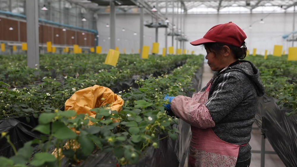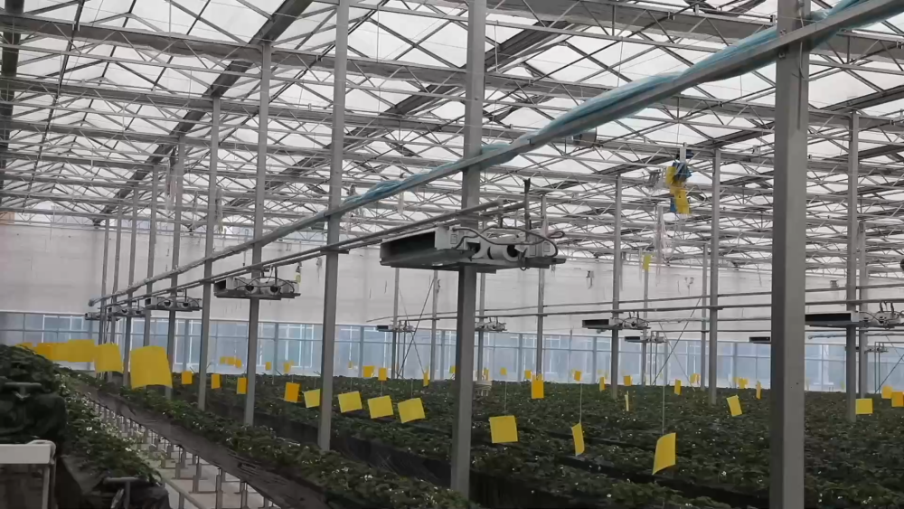 智慧農(nóng)場(chǎng)玻璃溫室現(xiàn)共種植三個(gè)品種、八萬株草莓,均為自主繁育的草莓苗。科學(xué)種植促進(jìn)了豐產(chǎn),兩座玻璃溫室均可實(shí)現(xiàn)一年四季連續(xù)生產(chǎn)。