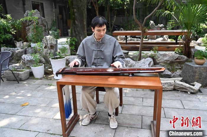 圖為古琴教師高廷鑫在江蘇揚州仁豐里歷史文化街區(qū)的永樂琴坊彈奏古琴。國璇 攝