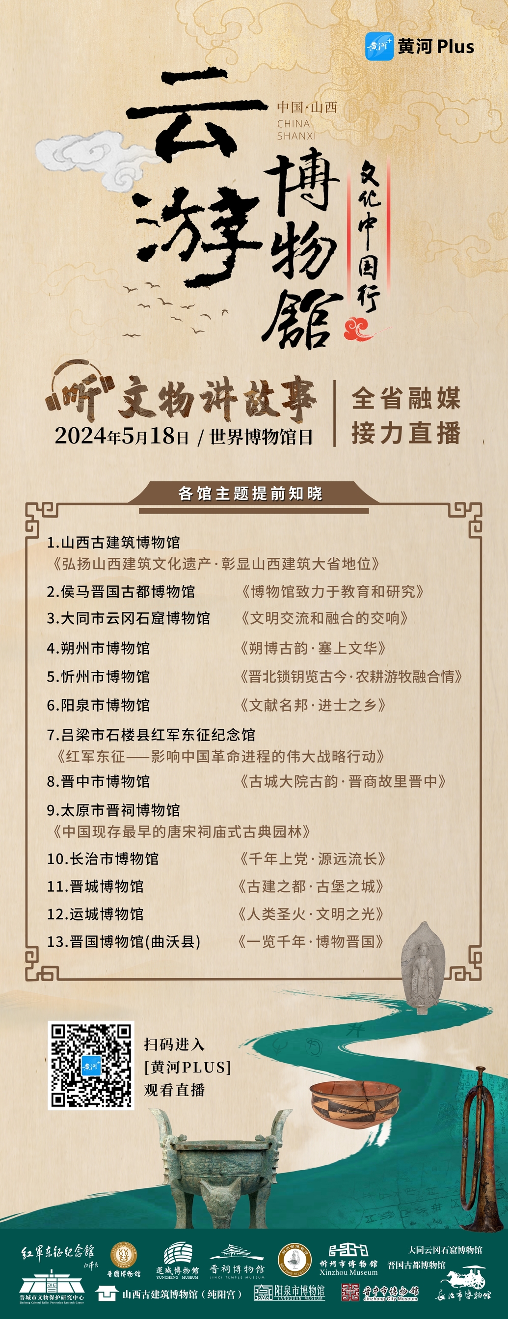 5月18日是世界博物館日,山西廣播電視臺(tái)視聽融媒體中心聯(lián)合全省11市廣電融媒體平臺(tái),共同發(fā)起《云游博物館 聽文物講故事》全省融媒接力直播活動(dòng),邀請(qǐng)文物專家、學(xué)者、博物館工作人員,帶大家一起云游太原市晉祠博物館、運(yùn)城博物館、大同市云岡石窟博物館、朔州市博物館、忻州市博物館、陽泉市博物館、晉中市博物館、長治市博物館、晉城博物館、侯馬晉國古都博物、晉國博物館(曲沃縣)、呂梁市石樓縣紅軍東征紀(jì)念館、山西古建筑博物館等13座特色博物館,圍繞13個(gè)博物館不同的主題,用線上直播的形式,講述藏品背后的文明密碼,助力公眾加深對(duì)博物館的了解,鑒賞山西豐富的館藏文物,感受中華文明中的山西貢獻(xiàn)。