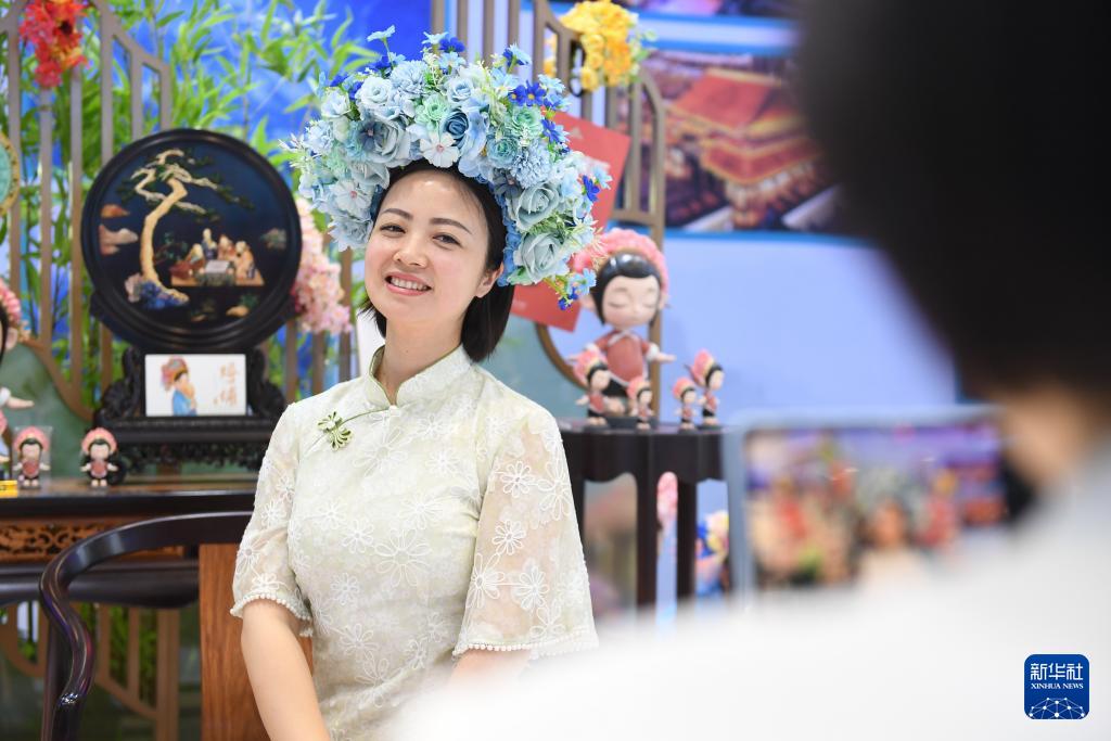 5月23日,參觀者在第二十屆文博會福建館體驗簪花。(新華社記者 毛思倩 攝)