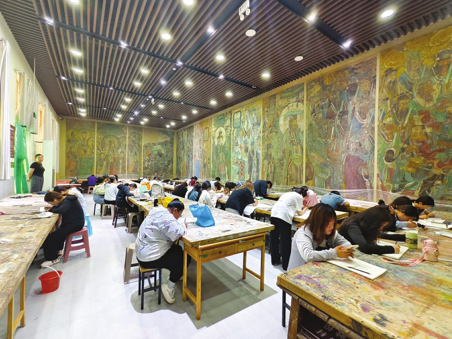 學生在永樂宮壁畫臨摹室臨摹壁畫。周明飛攝
