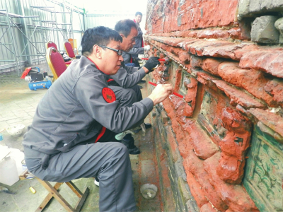 專家正在對四龍壁進行修復。解州關(guān)帝廟文物保護所供圖