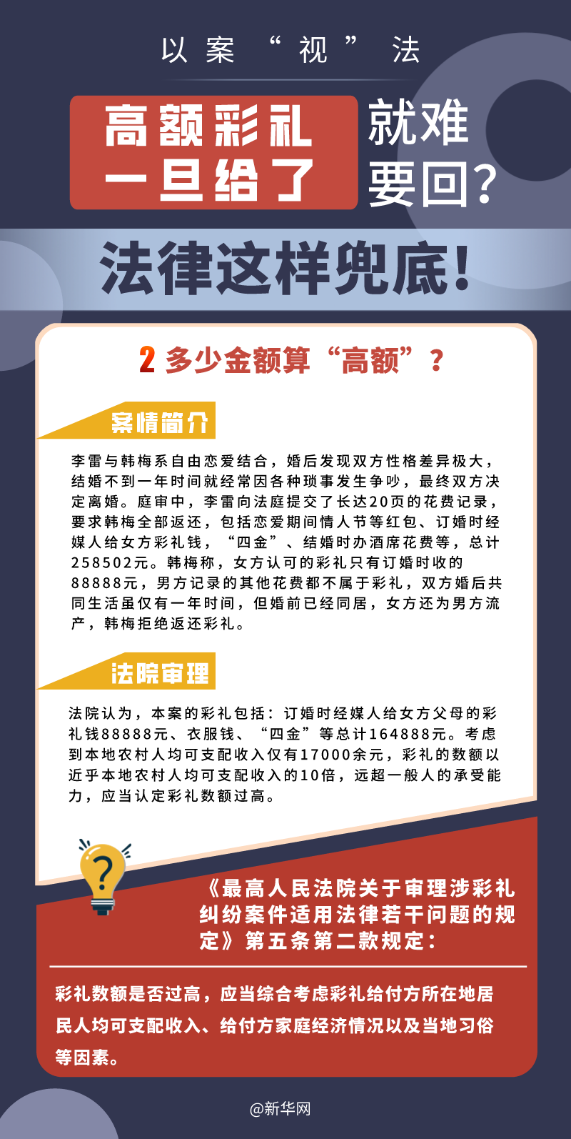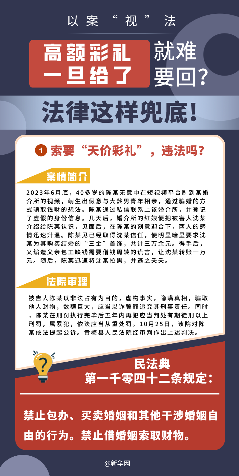 “五一”長假期間,各地迎來了婚禮高峰期,“彩禮”話題,尤其農(nóng)村高額彩禮現(xiàn)象備受關(guān)注。破解高價(jià)彩禮,在解決爭議的層面,司法盡了最大努力兜底。本期《以案“視”法》針對涉“高額彩禮”糾紛,帶大家學(xué)習(xí)相關(guān)法律知識。