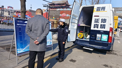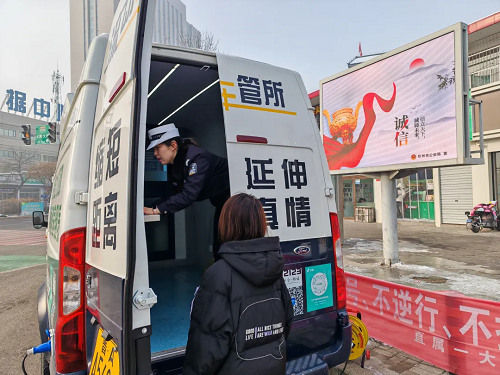 春節(jié)假期,城市、鄉(xiāng)村到處都彌漫著歡樂祥和的氣氛,初一至初七,在山西省忻州市忻府區(qū)光明西街古城北廣場、公園西街世紀(jì)花苑小區(qū)南門等人流量大、人員集中場所,忻州市公安局交警支隊的警郵車管便民服務(wù)車格外顯眼。“縮短距離、延伸真情”,這輛承載著為駕駛?cè)颂峁崆橹艿椒?wù)、為車輛安全出行提供保障,被群眾稱為“流動車管所”的車管便民服務(wù)車讓寒冬暖流涌動。