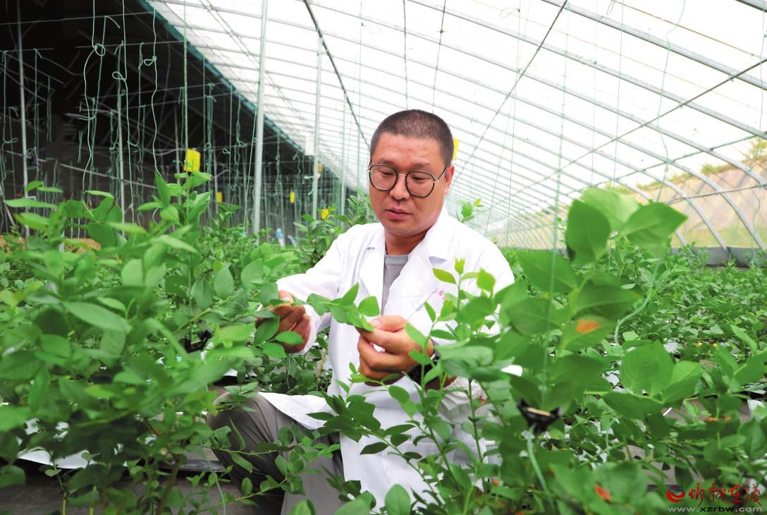 智慧大棚負責人馮祥君察看藍莓生長情況。